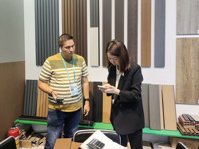 建材展位重點推出了墻板,格柵,樓梯踏板以及木塑戶外地板等新產(chǎn)品,從室內(nèi)到戶外產(chǎn)品一應(yīng)俱全。參展部門根據(jù)對去年秋季交易會的考察分析以及近期客戶最新詢盤情況的整合梳理,積極開拓更新參展產(chǎn)品。結(jié)合國外最新流行的趨勢,推出了拼花木紋,石紋等當(dāng)下十分暢銷的花色。利用立體燈箱,將產(chǎn)品優(yōu)勢,產(chǎn)品結(jié)構(gòu)剖面等信息直觀展示,讓客戶更加清晰地了解產(chǎn)品的性能和優(yōu)點,吸引諸多專業(yè)買家的觀看和洽談。此外,在攤位新增產(chǎn)品拼裝的體驗區(qū),增加產(chǎn)品小樣及配件的DIY拼裝,吸引客戶自己動手,大大提升了參與度和體驗感,讓客戶真切地感受到安糧的誠意與新意。